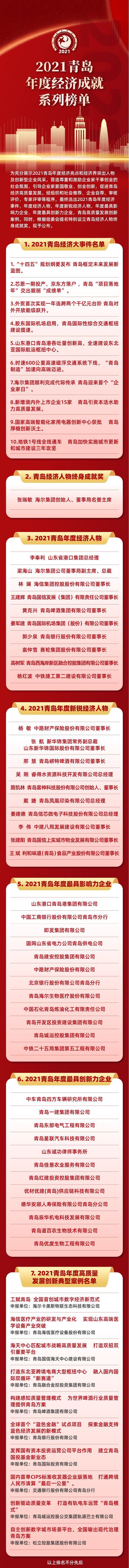 “十四五”计划纲要宣布、胶东国际机场启用等十大事件入选年度经济事件。山东省口岸集团有限公司总经理李奉利、海尔集团公司董事局副主席、总裁梁海山、海信集团董事长林澜等10位企业家荣获青岛年度经济人物称呼。中路工业包管股份有限公司董事长杨敏,新华锦集团有限公司常务副总裁张航等10位企业家荣获年度新锐经济人物。山东口岸青岛港集团有限公司、中国工商银行股份有限公司青岛市分行、即发集团有限公司等12家企业荣获青岛年度最具影响力企业。中车青岛四方车辆研究所有限公司、青岛红建投资控股集团有限公司、青岛东部电气工程有限公司等12家企业荣获青岛年度最具立异力企业。